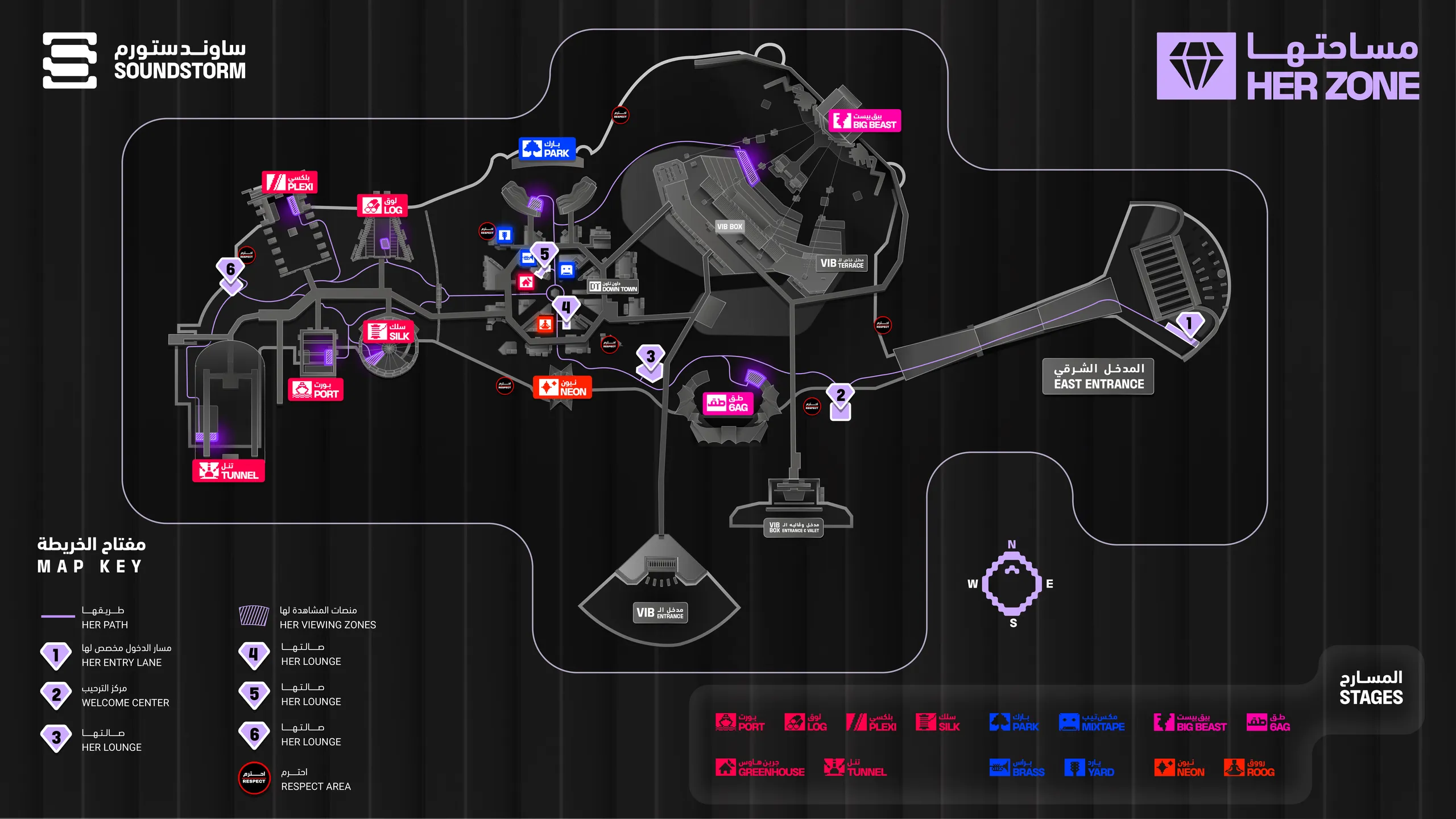 Check out HER Soundstorm, an exclusive female-only network of viewing areas and lounges. The HER map showcases where each HER Zone is located, along with the HER Path that guides the way. Relax in a HER Lounge, dance your heart out at a HER Zone at the main stages, and visit the HER Welcome Center for more info!